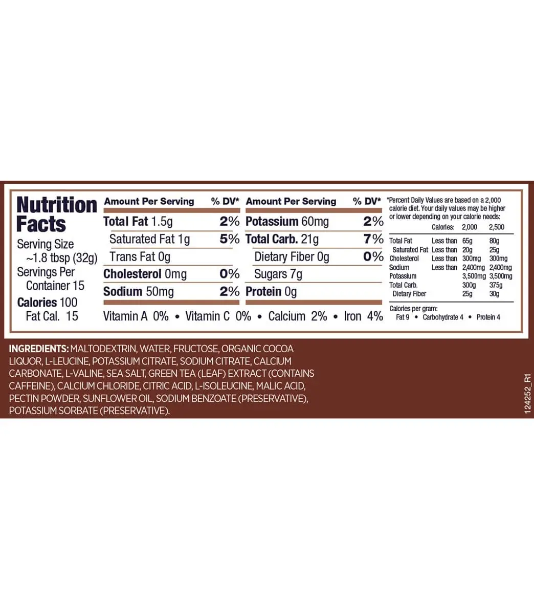 - Salted Caramel: Maltodextrin, Water, Fructose, Leucine, Sea Salt, Potassium Citrate, Sodium Citrate, Citric Acid, Calcium Carbonate, Valine, Natural Flavor, Green Tea (Leaf) Extract (Contains Caffeine), Gellan Gum, Isoleucine, Sunflower Oil, Sodium Benzoate (Preservative), Potassium Sorbate (Preservative).